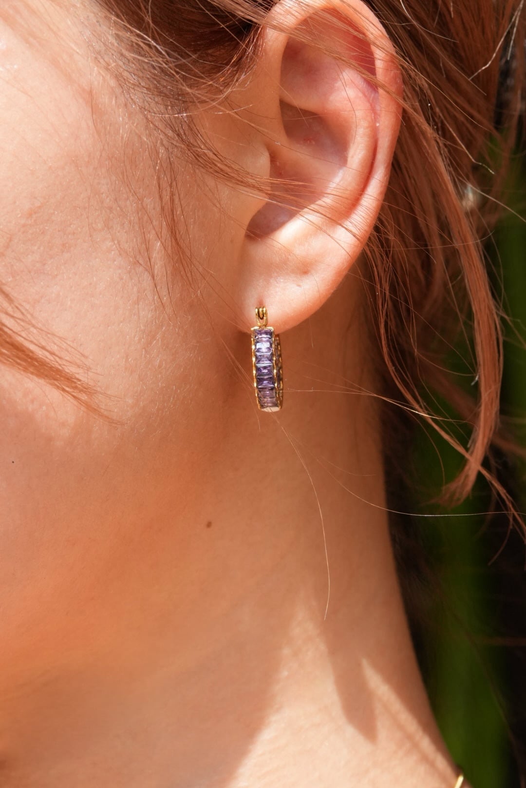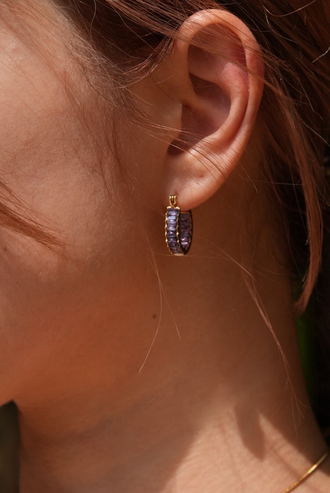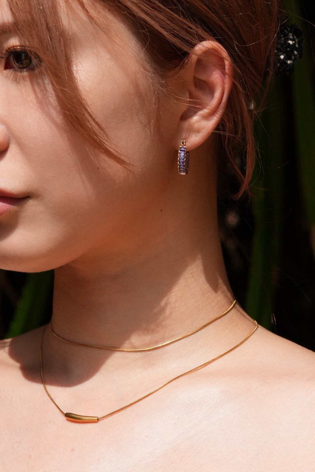 美しいパープルのジルコニアが装飾されたこのピアスは、ゴールドとの相乗効果により、高級感を演出します。さらに、裏側にもジルコニアが施されており、どこから見ても洗練されたこだわりのデザイン。 シンプルなコーディネートにも華やかさをプラスしており、普段使いから特別なシーンまで幅広く活躍すること間違いない一品です。