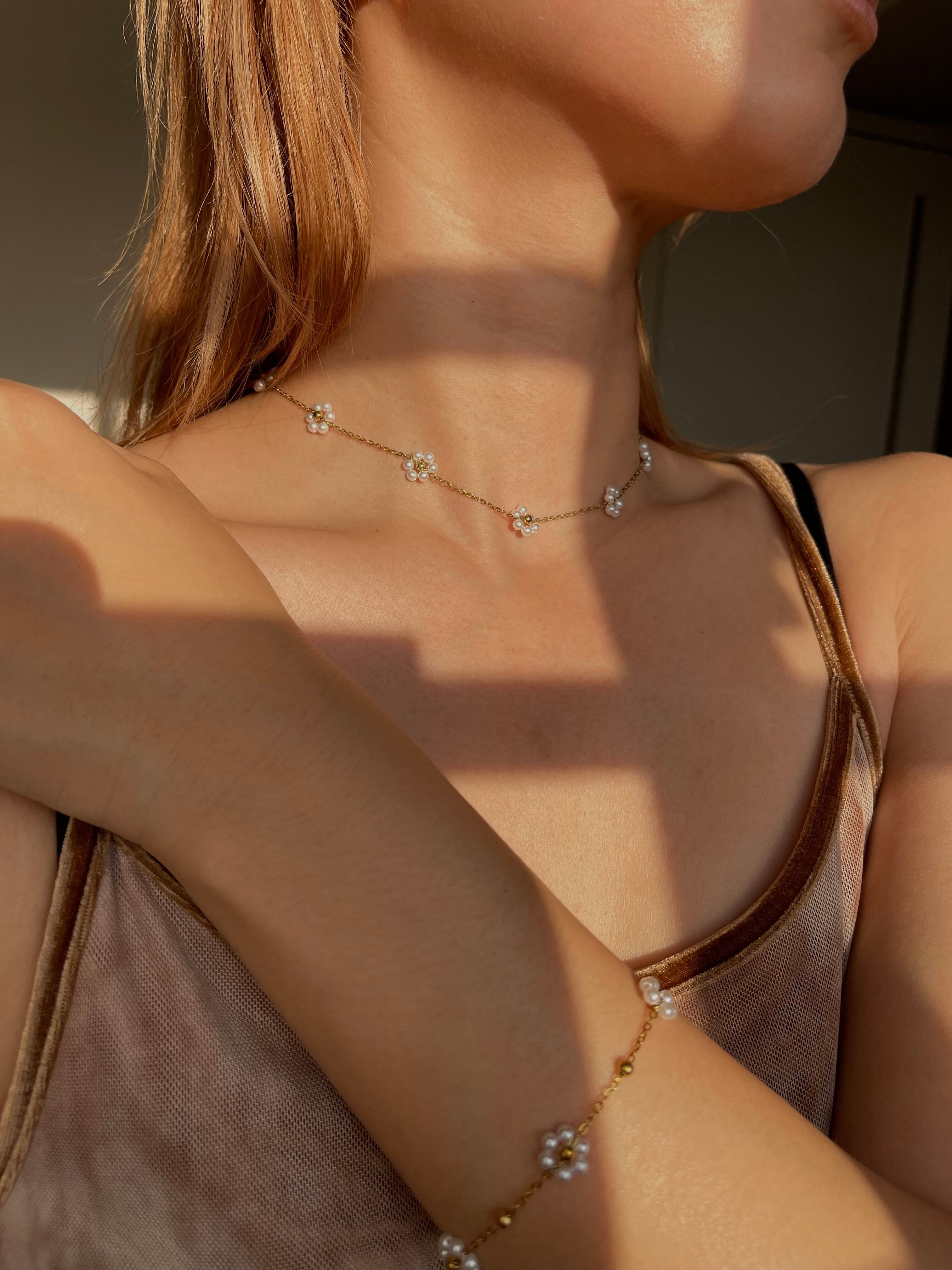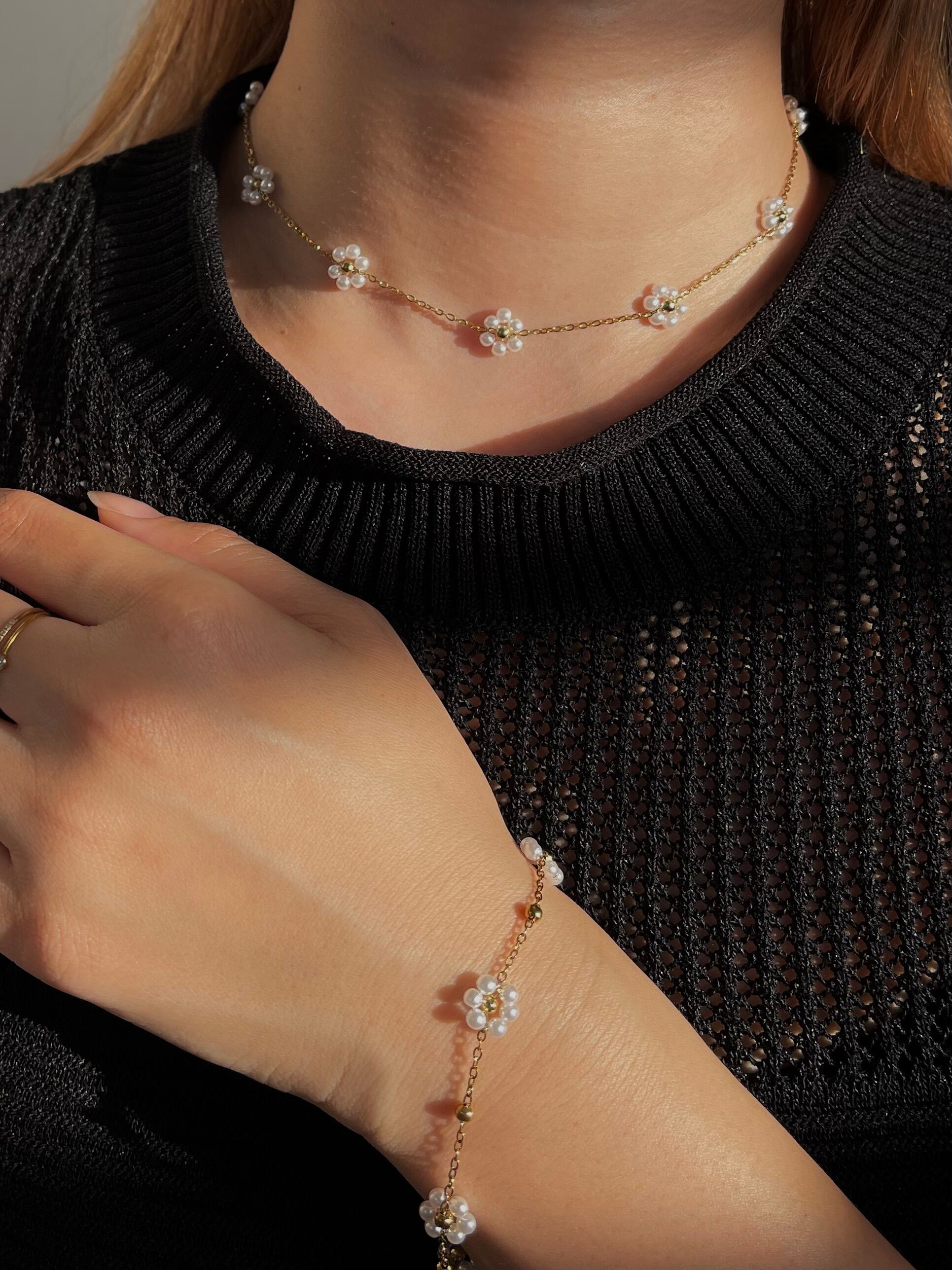 小花のように愛らしいパールが特徴のこのネックレスとブレスレットのセットは、あなたのスタイルにトレンド感をプラスします。