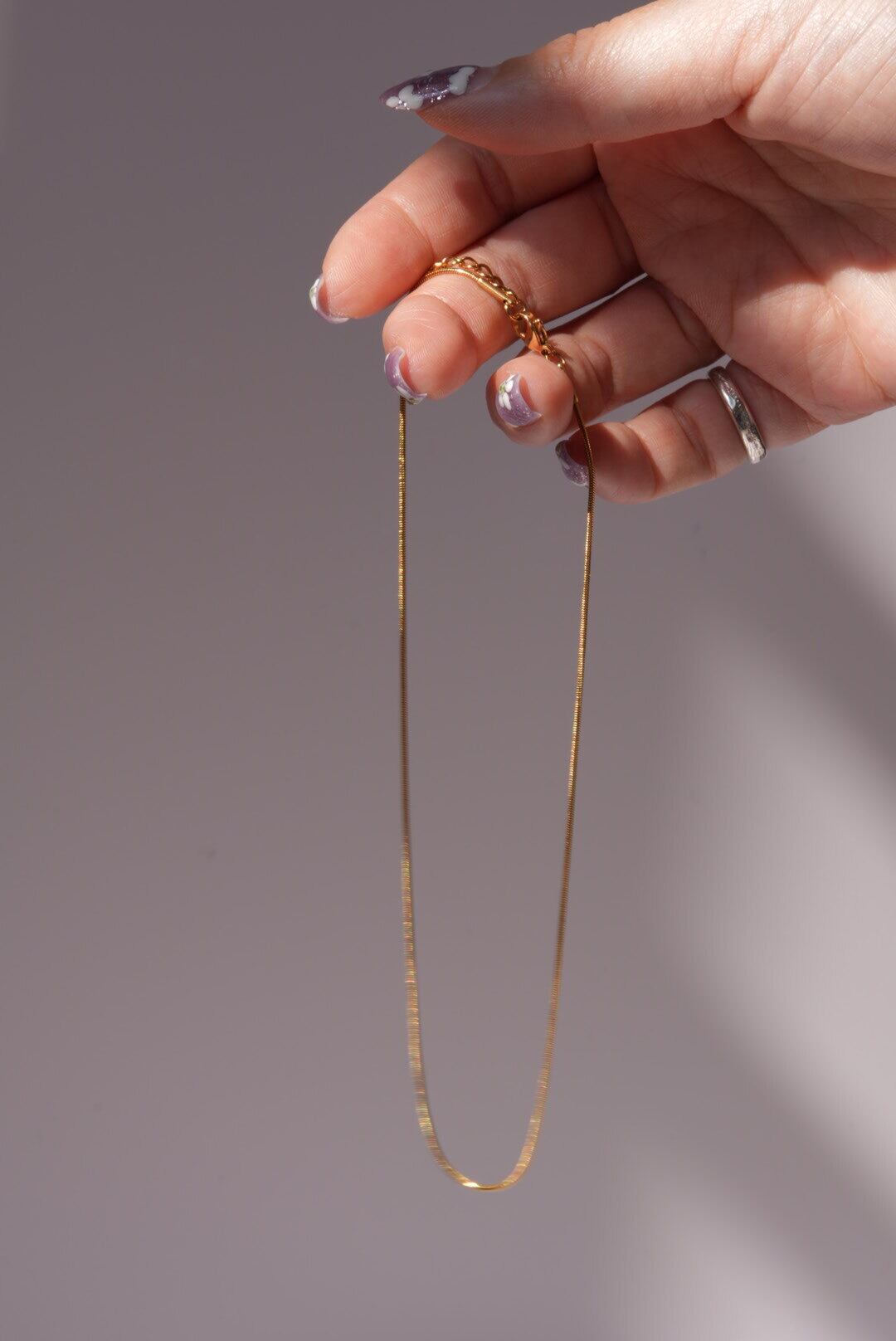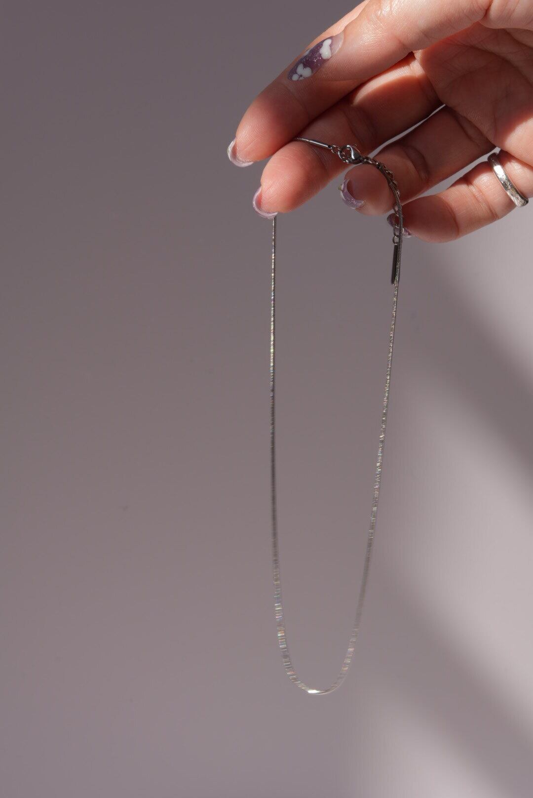 細めのデザインながらも存在感をしっかりと放つこのネックレスは、どんなシーンでもあなたの魅力を引き立てます。単体での使用はもちろん、他のネックレスとの重ね付けも簡単に楽しめるため、スタイリングの幅も広がります。